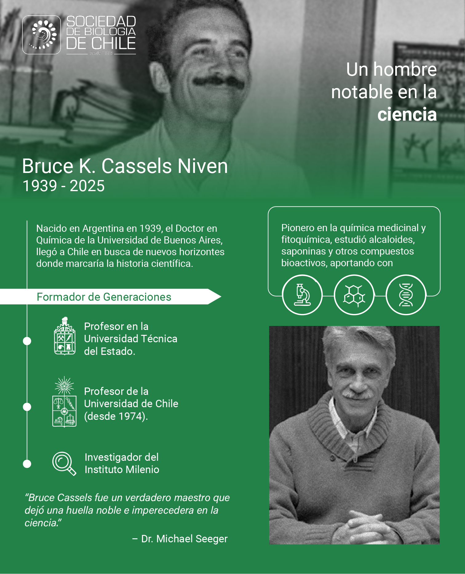 La Sociedad de Biología de Chile rinde homenaje al profesor Bruce K. Cassels Niven (1939–2025), destacado científico que dejó una huella imborrable en la química, la biología y la formación de generaciones de investigadores en nuestro país.