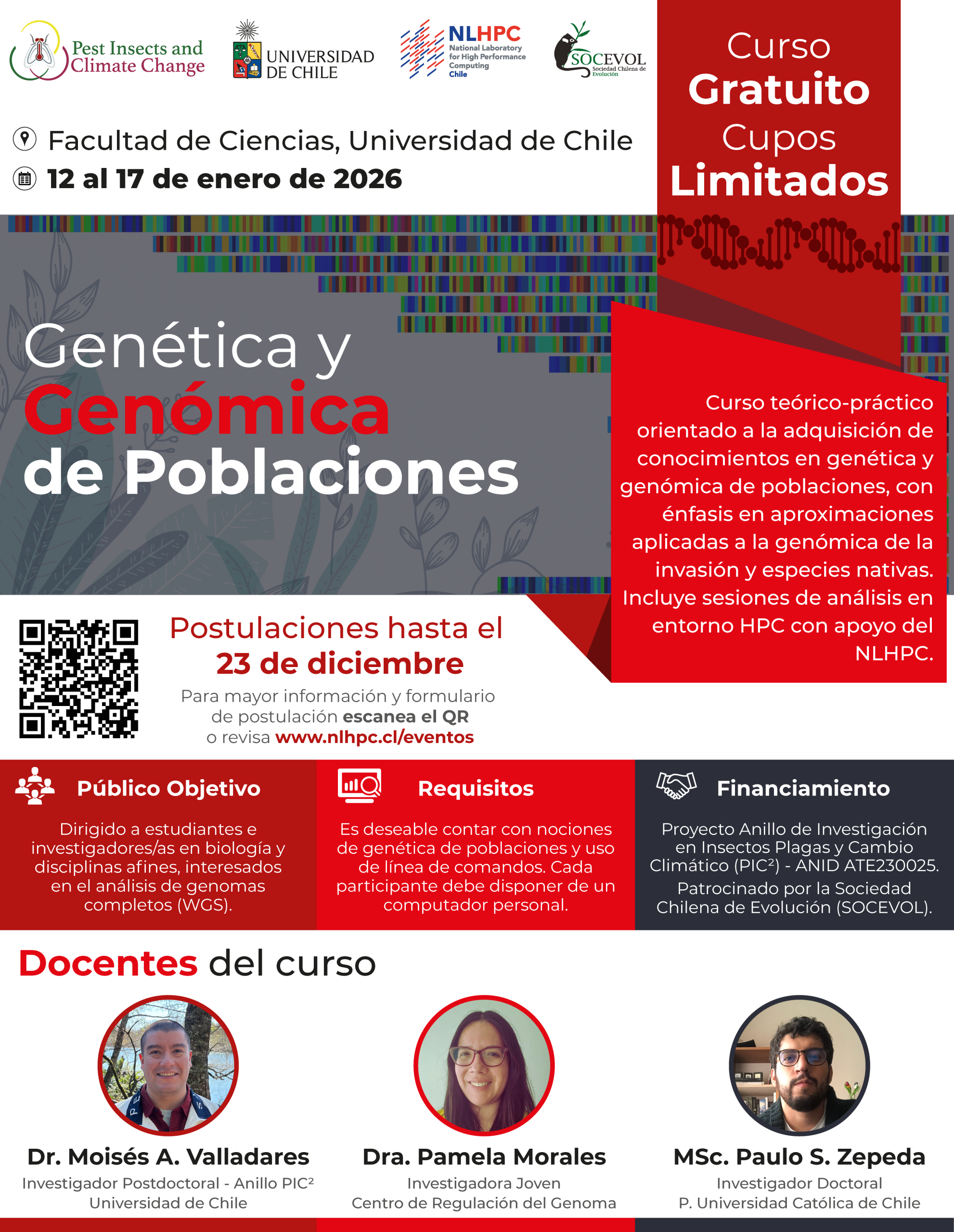 A lo largo de seis jornadas, que combinan clases teóricas y talleres prácticos, el curso abordará desde los fundamentos de la genética de poblaciones hasta temas como flujo génico, demografía, selección natural, adaptación local y asociación genotipo-ambiente. Las sesiones prácticas se realizarán con el apoyo del Laboratorio Nacional de Computación de Alto Rendimiento (NLHPC), utilizando el supercomputador Guacolda-Leftraru Epu, que permitirá a las y los participantes ejecutar análisis reales en un entorno HPC.
