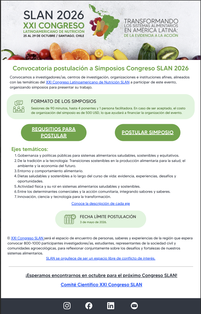 Se ha abierto la convocatoria para postular Simposios para el XXI Congreso Latinoamericano de Nutrición (SLAN 2026), que se llevará a cabo en Santiago de Chile del 25 al 29 de octubre. Bajo el lema «Transformando los sistemas alimentarios en América Latina: de la evidencia a la acción», este evento busca reunir a los mejores investigadores y organizaciones de la región.