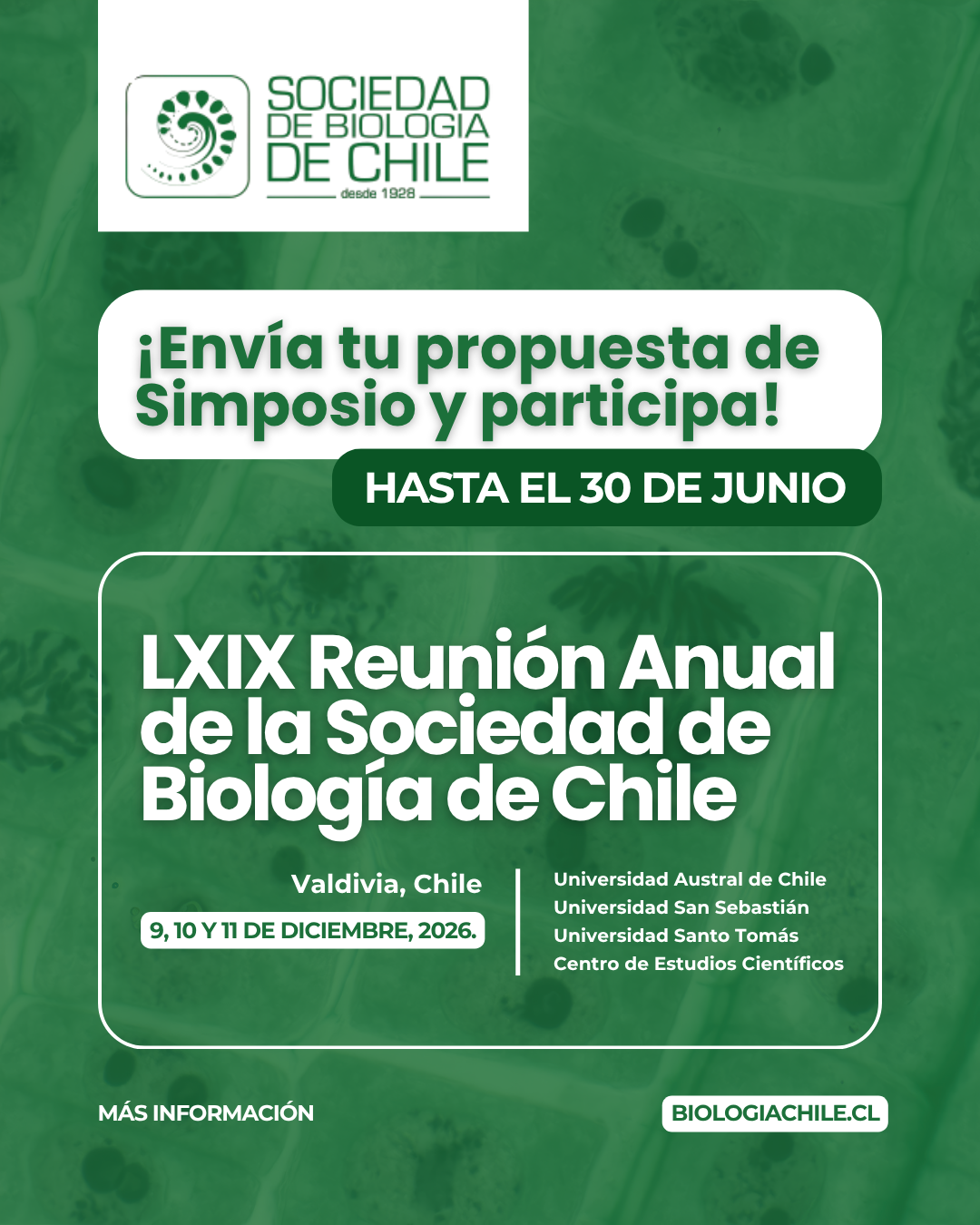 Junto con saludar, y esperando que se encuentren muy bien, estamos muy contentos de invitarlos a enviar propuestas de Simposios a nuestra LXIX Reunión Anual que se realizara en Valdivia entre los días 9 al 11 de diciembre en las dependencias de la Universidad Austral de Chile, Universidad San Sebástian, Universidad Santo Tomás y el Centro de Estudios Científicos.