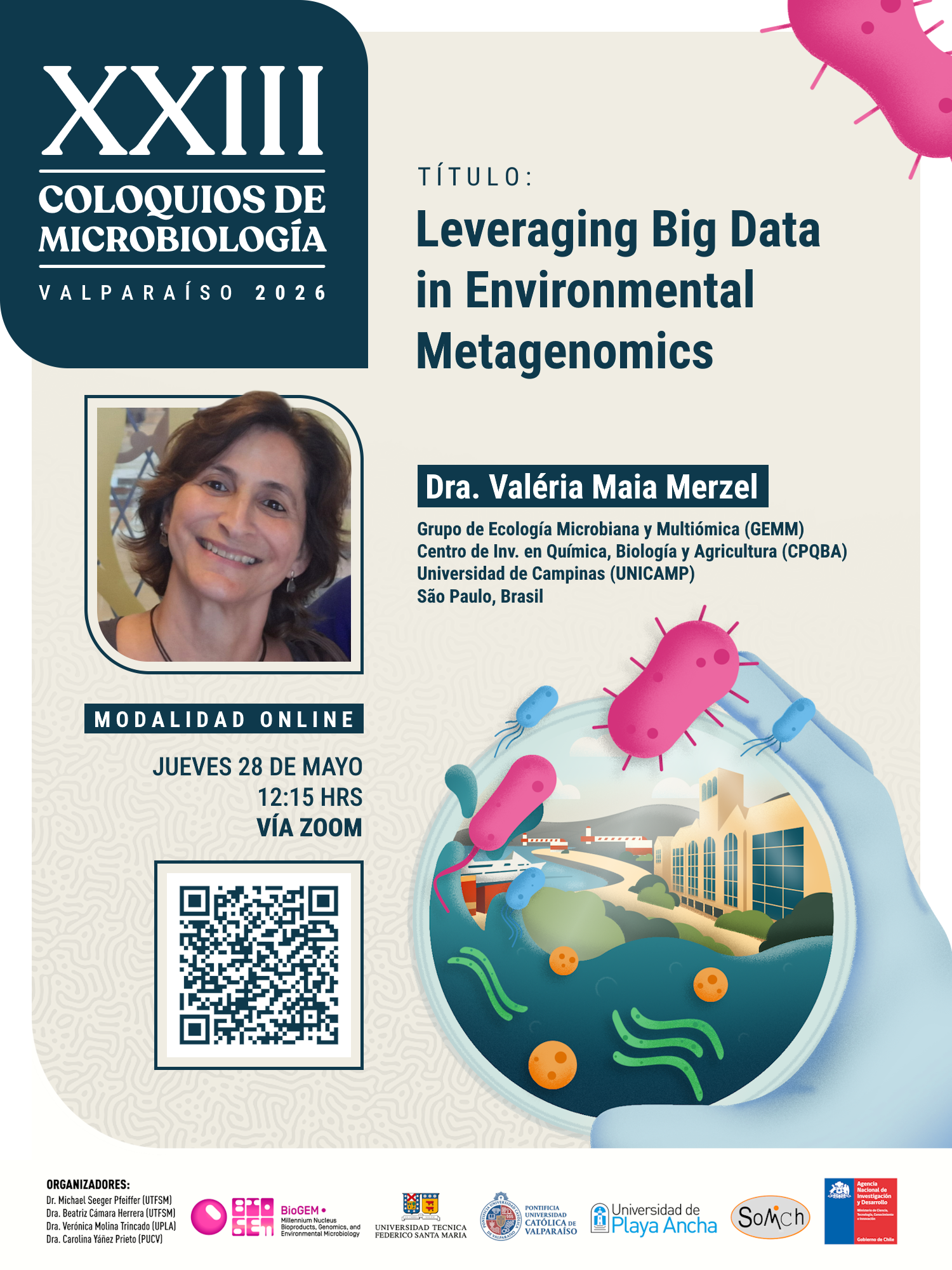 Expositora: Dra. Valéria Maia Merzel del Microbial Ecology and Multiomics Group (GEMM), Research Center for Chemistry, Biology and Agriculture (CPQBA) & University of Campinas, Brasil (UNICAMP).